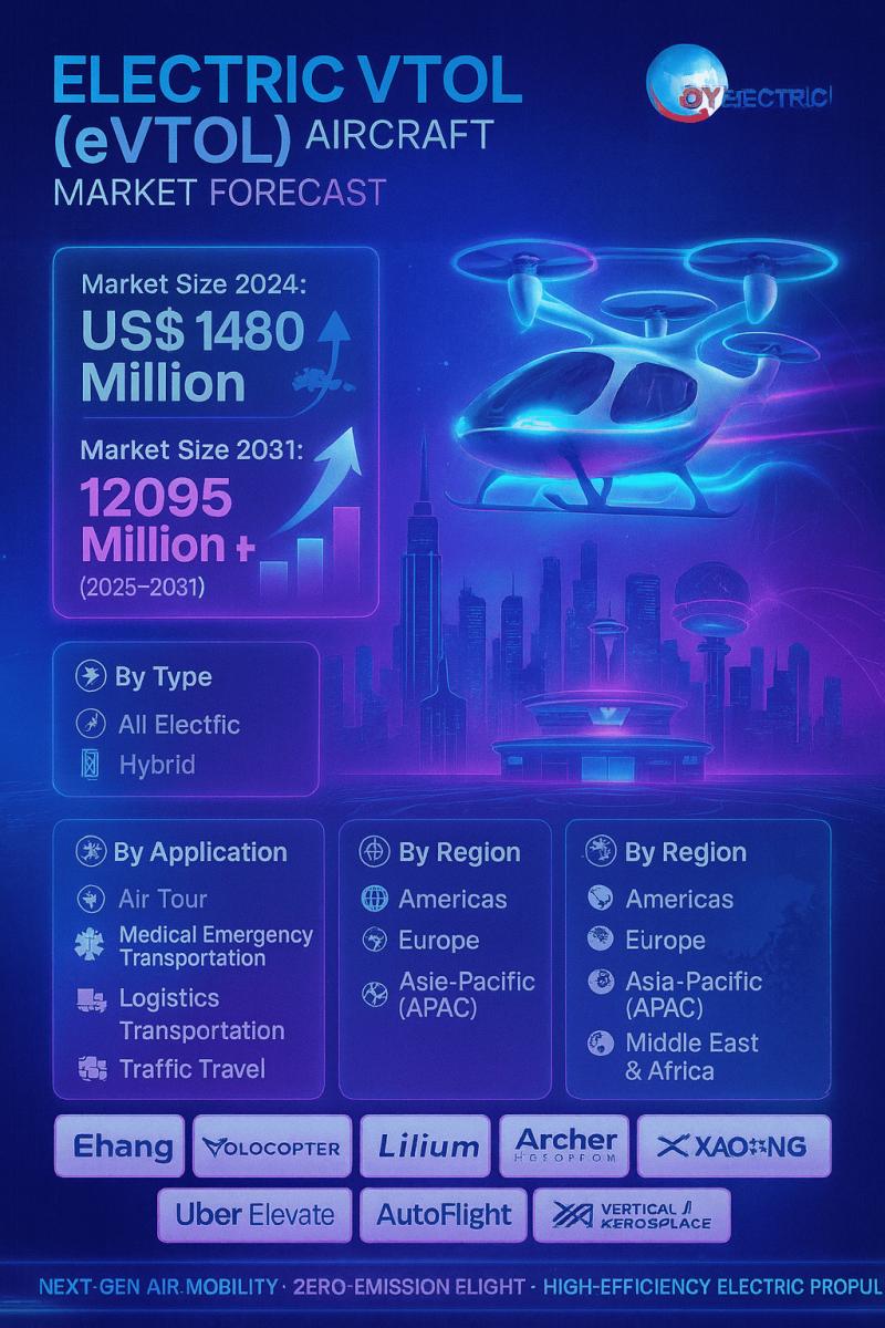 The global market for Electric VTOL (eVTOL) Aircraft was estimated to be worth US$ 1480 million in 2024 and is forecast to a readjusted size of US$ 12095 million by 2031 with a CAGR of 35.0% during the forecast period 2025-2031.