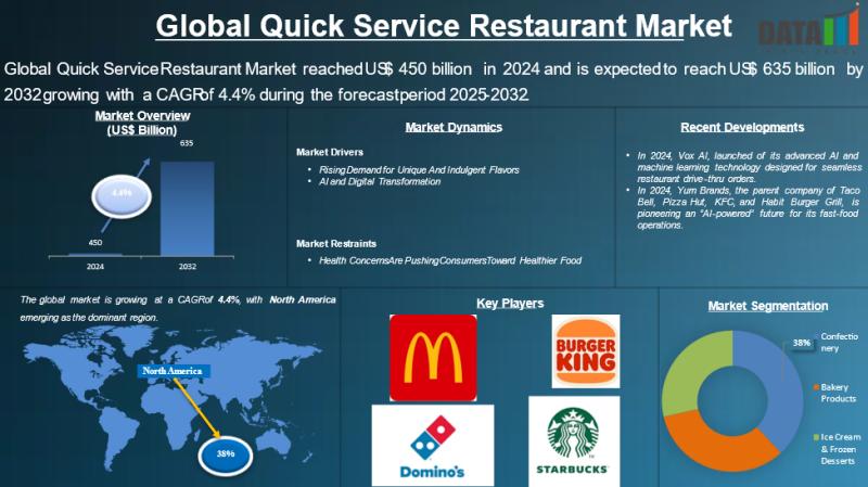 As per DataM intelligence research report" Global Quick Service Restaurant Market reached US$ 450.1 billion in 2024 and is expected to reach US$ 635.2 billion by 2032 growing with a CAGR of 4.4% during the forecast period 2025-2032." Urbanization, convenience demand, and digital ordering are fueling growth in the quick service restaurant segment.