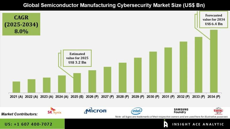 InsightAce Analytic Pvt. Ltd. announces the release of a market assessment report on the "Global Semiconductor Manufacturing Cybersecurity Market Size, Share & Trends Analysis Report by Security Type (Services, Network Security (1st Layer), Endpoint Security, and Cloud Security (1st Layer)), Device Type (Assembly and Packaging Equipment, Wafer Manufacturing/Wafer Processing Equipment, Automated Material Handling Systems, Test and Measurement Equipment),-Market Outlook And Industry Analysis 2034"Global Semiconductor Manufacturing Cybersecurity Market Size is valued at US$ 3.0 Bn in 2024 and is predicted to reach US$ 6.4 Bn by the year 2034 at an 8.0% CAGR over the forecast period 2025-2034.