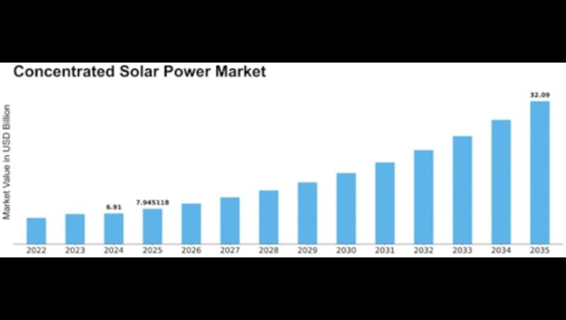 MRFR indicates that the concentrated solar power (CSP) market was valued at USD 6.91 billion in 2024. It is expected to expand from USD 7.945 billion in 2025 to USD 32.09 billion by 2035, with a projected CAGR of 14.98% from 2025 to 2035.