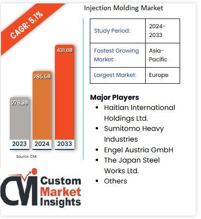 Global Injection Molding Market size was valued at USD 285.5 Billion in 2024 and is expected to reach USD 431.6 Billion by 2033, at a CAGR of 5.1% during the forecast period 2024 - 2033.