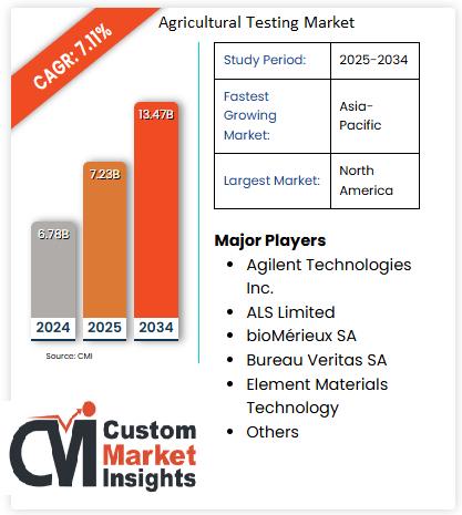 According to current market research conducted by the CMI Team, the global Agricultural Testing Market is expected to record a CAGR of 7.11% from 2025 to 2034. In 2025, the market size is projected to reach a valuation of USD 7.23 Billion. By 2034, the valuation is anticipated to reach USD 13.47 Billion.