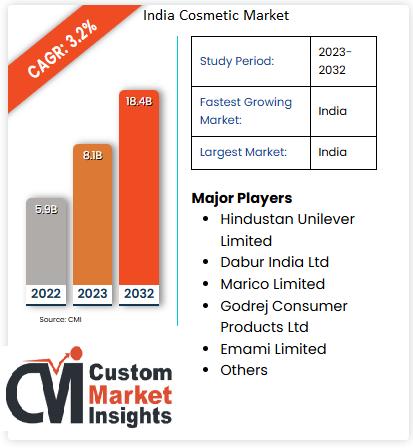 Indian Cosmetic Market size was valued at USD 8.1 Billion in 2023 and is expected to reach USD 18.4 Billion by 2032, at a CAGR of 3.2% during the forecast period 2023 - 2032.