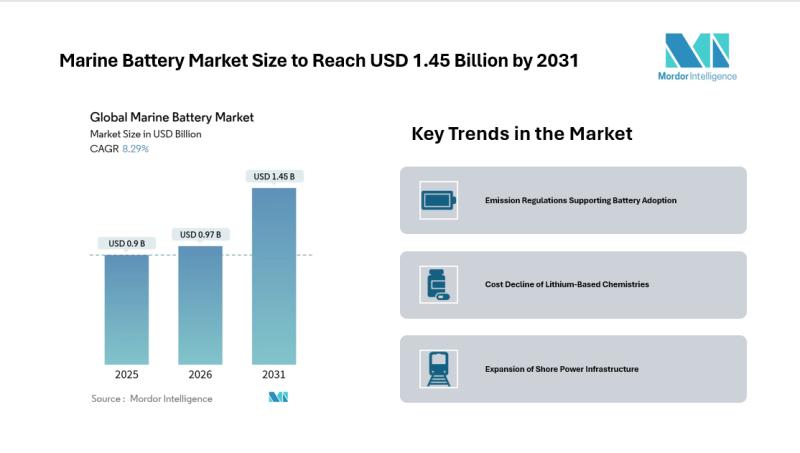 According to Mordor Intelligence, the global marine battery market size was valued at USD 0.97 billion in 2026, reaching USD 1.45 billion by 2031. The global marine battery market forecast reflects steady expansion as vessel operators respond to emission mandates and rising fuel efficiency expectations.