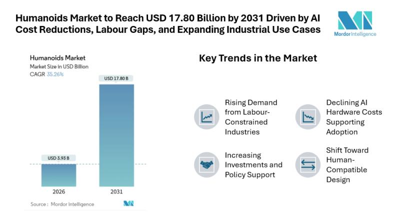 According to Mordor Intelligence, the humanoids market size is estimated at USD 3.93 billion in 2026 and is expected to reach USD 17.80 billion by 2031, registering a CAGR of 35.26% during the forecast period (2026-2031). This strong market growth reflects rising demand for…