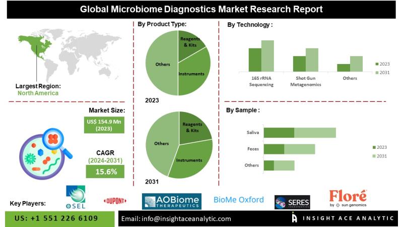 InsightAce Analytic Pvt. Ltd. announces the release of a market assessment report on the "Global Microbiome Diagnostics Market - (By Product (Reagents & Kits, Instruments), By Technology (16S rRNA Sequencing, Shot Gun Metagenomics, Metatranscriptomics, Other Technology), By Sample (Feces, Saliva, Skin, Other Sample), By Application (Disease Diagnostics Application (Gastrointestinal Disorders, Metabolic Diseases, Other Application), Research Application), By End-User (Hospitals, Academic and Research Institutes, Biotechnology and Pharmaceutical Companies)), Trends, Industry Competition…