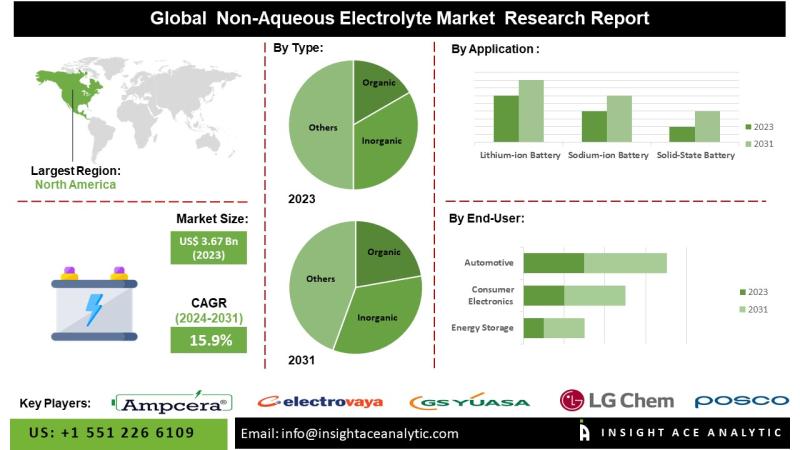 InsightAce Analytic Pvt. Ltd. announces the release of a market assessment report on the "Global Non-Aqueous Electrolyte Market- (By Application (Lithium-ion Battery, Sodium-ion Battery, Solid-State Battery and Others), By End-Use Industry (Automotive, Consumer Electronics, Energy Storage, and Others), By Type (Organic and Inorganic)) Trends, Industry Competition Analysis, Revenue and Forecast To 2034."