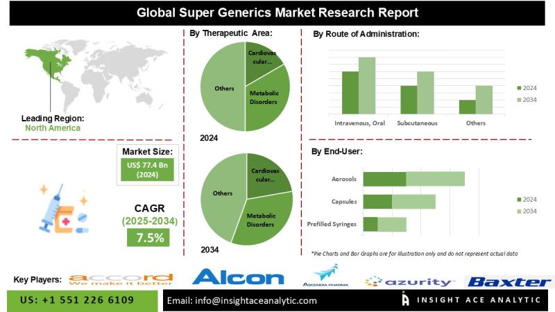 InsightAce Analytic Pvt. Ltd. announces the release of a market assessment report on the "Global Super Generics Market - (By Therapeutic Area (Cardiovascular Disorders, Metabolic Disorders, Neurological Disorders, Oncological Disorders, Respiratory Disorders and Other Disorders), By Route of Administration (Intravenous, Oral, Subcutaneous and Others), By Type of Molecule (Small and Other Molecules), By Type of Small Molecule (Generics and Other Small Molecules), By Type of Product (Aerosols, Capsules, Prefilled Syringes,…