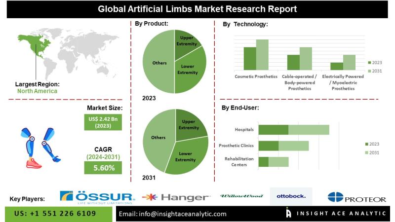 InsightAce Analytic Pvt. Ltd. announces the release of a market assessment report on the "Global Artificial Limbs Market - (By Product (Upper Extremity, Lower Extremity, Sockets, Liners, Others), By Technology (Cosmetic Prosthetics, Cable-operated/Body-powered Prosthetics, Electrically Powered/Myoelectric Prosthetics, Others), By End-use (Hospitals, Rehabilitation Centers, Prosthetic Clinics)), Trends, Industry Competition Analysis, Revenue and Forecast To 2031."