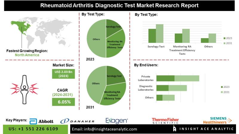 InsightAce Analytic Pvt. Ltd. announces the release of a market assessment report on the "Global Rheumatoid Arthritis Diagnostic Tests Market - (By Test Type (Serology Test (Erythrocyte Sedimentation Rate (ESR), Rheumatoid Factor (RF), Anti-cyclic Citrullinated Peptide (anti-CCP), Antinuclear Antibody (ANA), Uric Acid, Other Tests), Monitoring RA Treatment Efficiency Tests (Salicylate Level Count, Muscle Enzyme Tests (CPK, Aldolase), Creatinine Test)), By End User (Diagnostic Laboratories, Private Laboratories, Public Laboratories, Ambulatory Surgical…