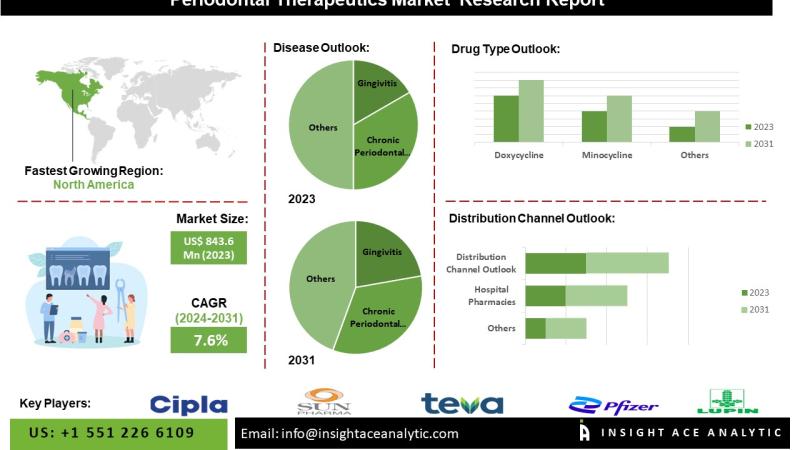 InsightAce Analytic Pvt. Ltd. announces the release of a market assessment report on the "Global Periodontal Therapeutics Market- (By Disease (Chronic Periodontal Disease, Aggressive Periodontal Disease, Gingivitis and Others), By Drug Type (Doxycycline, Minocycline, Chlorhexidine, Metronidazole and Others)), By Distribution Channel, By Region, Trends, Industry Competition Analysis, Revenue and Forecast To 2031."