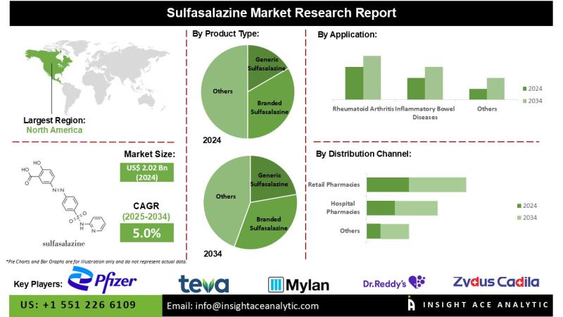 InsightAce Analytic Pvt. Ltd. announces the release of a market assessment report on the "Global Sulfasalazine Market- (By Product Type (Generic Sulfasalazine, Branded Sulfasalazine), By Application (Rheumatoid Arthritis, Inflammatory Bowel Diseases, Crohn's Disease, Ulcerative Colitis), By Distribution Channel (Hospital Pharmacies, Retail Pharmacies, Online Pharmacies, Specialty Clinics), By Patient Demographics (Adults, Pediatrics), By Disease Severity (Mild, Moderate, Severe), By Prescription Type (Over-the-Counter (OTC) with medical supervision, Prescription-only), By End-user (Hospitals, Clinics,…