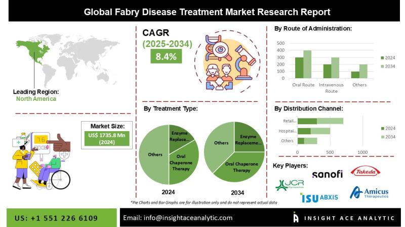 "Fabry Disease Treatment Market" in terms of revenue was estimated to be worth $ 1735.8 Mn in 2024 and is poised to reach $ 3839.8 Mn by 2034, growing at a CAGR of 8.4% from 2025 to 2034 according to a new report by InsightAce Analytic.
