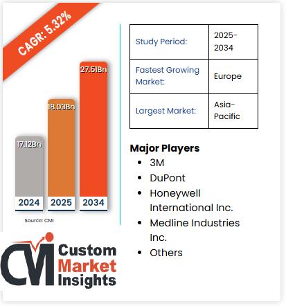 As per the Personal Protective Equipment (PPE) Market size analysis conducted by the CMI team, the Personal Protective equipment (PPE) market is expected to record a CAGR of 5.32% from 2025 to 2034. In 2025, the market size was USD 18.03 Billion. By 2034, the valuation is anticipated to reach USD 27.51 Billion.