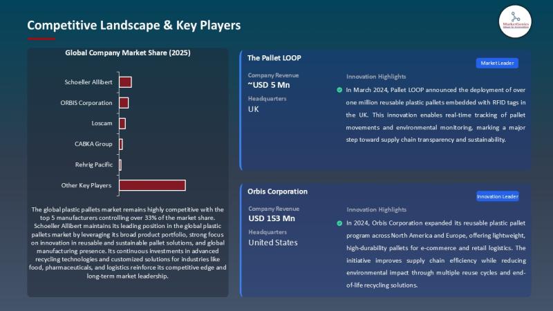 Companies such as ORBIS Corporation, CABKA Groupand Schoeller Allibert are deploying new recyclable HDPE and PP pallets engineered for food, pharma, and high-load industrial cycles.