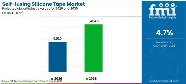 The Self-fusing Silicone Tape Market is valued at USD 925.0 million in 2026 and is projected to reach USD 1,464.2 million by 2036, expanding at a CAGR of 4.70%. The Market's growth reflects increasing reliance on rapid sealing, electrical insulation, and moisture exclusion solutions that operate without adhesives. As maintenance programs across utilities, telecom, and industrial sectors standardize repair materials, the Market is becoming integral to system reliability and field…