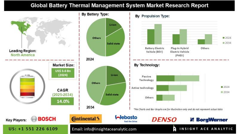 InsightAce Analytic Pvt. Ltd. announces the release of a market assessment report on the "Global Battery Thermal Management System Market Size, Share & Trends Analysis Report By Vehicle Type (Passenger Vehicles, Commercial Vehicles), Battery Type (Li-ion, Solid state), Propulsion Type (Battery Electric Vehicle (BEV), Plug-In Hybrid Electric Vehicle (PHEV), Hybrid Electric Vehicle (HEV)), Battery Capacity (500 KWH), Offering (BTMS with Battery, BTMS without Battery), Technology (Active technology, Passive Technology, Hybrid Technology)- Market Outlook And Industry Analysis 2034"The Global Battery Thermal Management System Market Size is valued at USD 3.6 Bn in 2024 and is predicted to reach USD 13.4 Bn by the year 2034 at an 14.0% CAGR during the forecast period for 2025-2034.