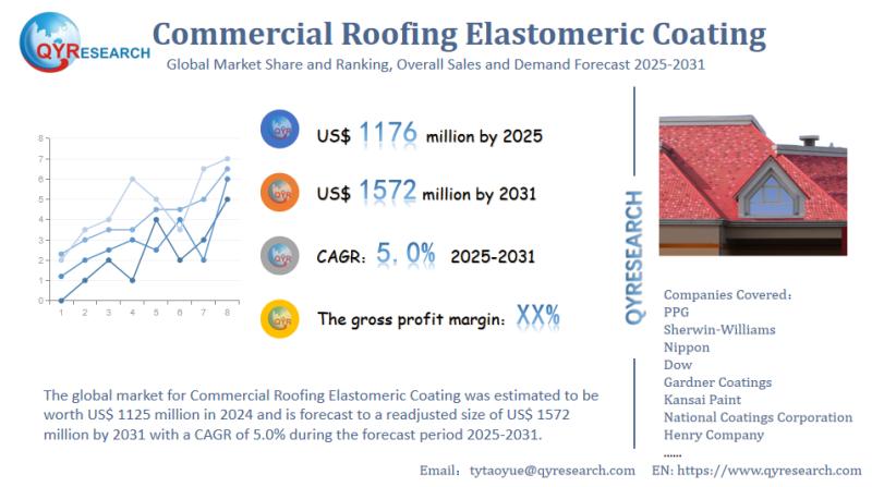 Unlock the Future of the Commercial Roofing Elastomeric Coating Market: Comprehensive Global Market Report 2025-2031Global leading market research publisher QYResearch published the release of its latest report, "Commercial Roofing Elastomeric Coating - Global Market Share, Ranking, Sales, and Demand Forecast 2025-2031". This in-depth report provides a complete analysis of the global Commercial Roofing Elastomeric Coating market, offering critical insights into market size, share, demand, industry development status, and future forecasts. Whether you're a stakeholder, investor, or industry player, this report equips you with the data and strategies needed to stay ahead in a rapidly evolving market.