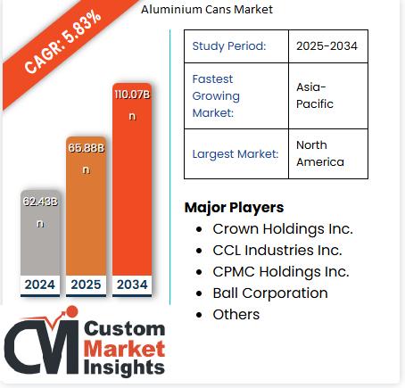 According to Custom Market Insights (CMI), The Global Aluminium Can Market is expected to grow at a compound annual growth rate of 5.83% during the forecast period from the year 2025 to the year 2034.The market is expected to reach U.S. dollars 110.07 Billion by 2034, which will grow from U.S. dollars 65.88 Billion in 2025. Aluminium cans have been used extensively for packaging in the food and beverages industry. It is considered one of the easiest ways of transporting food products and liquids without hampering the quality and taste of the Product for a long period.
