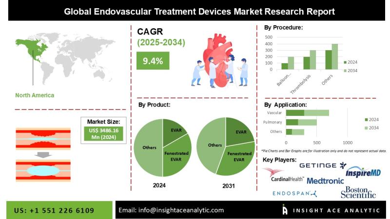 The newly published report titled "Global Endovascular Treatment Devices Market (Product (percutaneous endovascular aneurysm repair (EVAR), fenestrated EVAR, aortic stents biodegradable stents, self-expanding nitinol stents, thoracic aortic aneurysm grafts and other devices), Procedure (Ballon Angioplasty, Angioplasty With Stent Replacement, Drug-Eluting Stents Renal Artery Angioplasty and Stenting Carotid Artery, Thrombosis, Renal Artery Angioplasty and Stenting, Transfemoral Carotid Artery Revascularization, Intravascular Brachytherapy, Carotid Artery Stenting), Application (pulmonary, vascular, cardiology surgery, neurology and radiology))- By Trends, Industry Competition Analysis, Covid-19 Analysis, Revenue (US$ Billions) and Forecast Till 2034." of InsightAce Analytic Pvt. Ltd. features detailed industry analysis and an extensive study on the market, exploring its significant factors.The global Endovascular Treatment Devices market is estimated to reach over USD 8398.23 Million by 2034, exhibiting a CAGR of 9.4% during the forecast period.