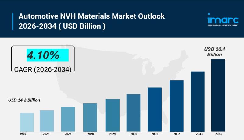 The global Automotive NVH Materials Market was valued at USD 14.2 Billion in 2025 and is forecast to reach USD 20.4 Billion by 2034, growing at a CAGR of 4.10% during 2026-2034. This growth is driven by increasing vehicle manufacturing, stringent noise regulations, growing consumer demand for quieter rides, transition to electric vehicles, and advancements in lightweight, sustainable acoustic materials.