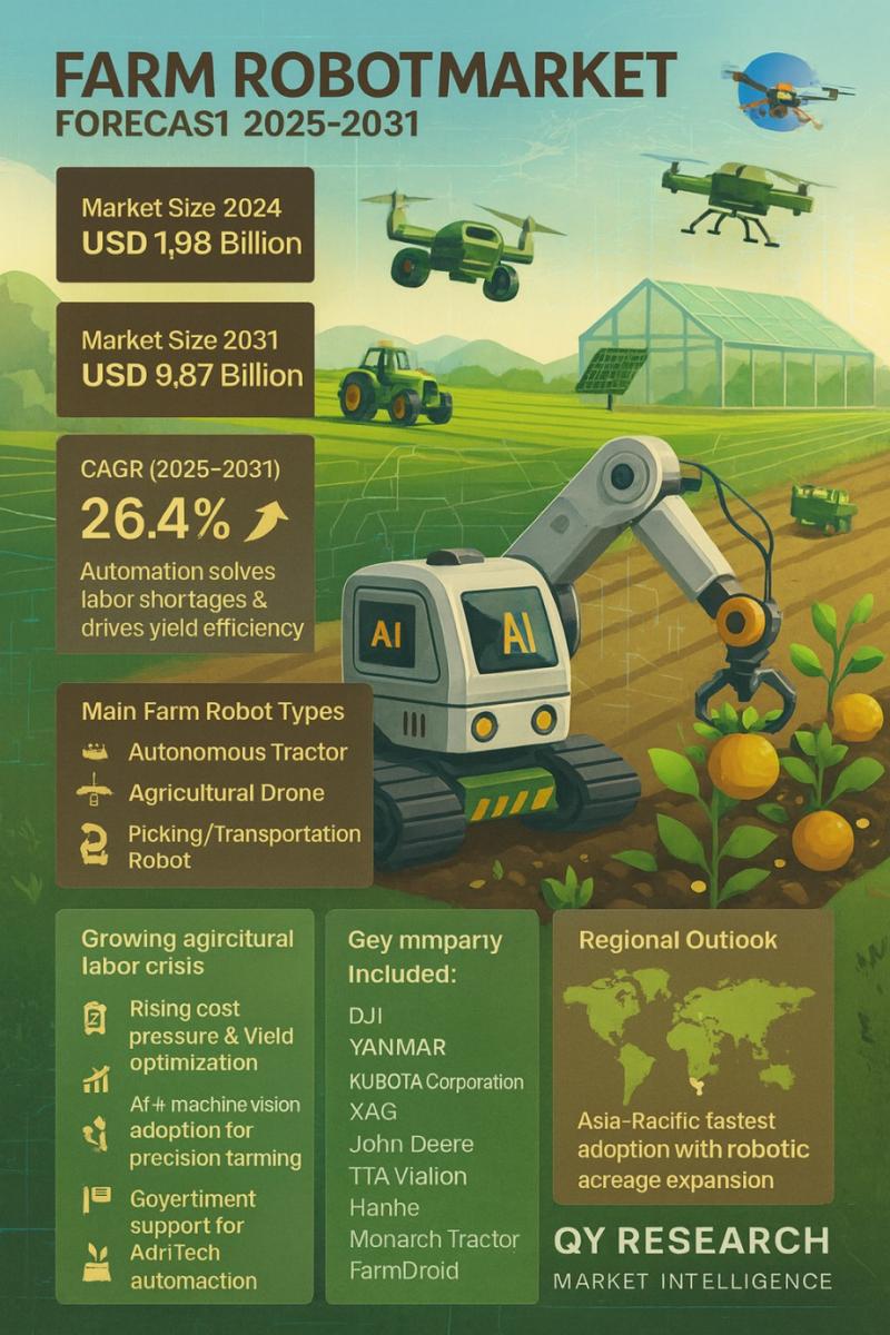 Accourding to QY Research has released a new publication titled "Global Farm Robot Market Share and Ranking, Overall Sales and Demand Forecast 2025-2031." This comprehensive study provides an in-depth evaluation of the worldwide Farm Robot industry, uncovering the major forces influencing market growth and delivering high-value insights for investors, industry leaders, and strategic decision-makers. The report examines critical elements such as market dynamics, evolving technologies, segmentation trends, regional developments, and the competitive landscape. With data backed by rigorous research and expert interpretation, it offers an authoritative guide to understanding the macroeconomic and microeconomic factors reshaping the global market.