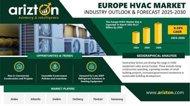 Industry Analysis Report, Regional Outlook, Growth Potential, Price Trends, Competitive Market Share & Forecast 2025-2030.According to Arizton research, Europe's HVAC market [https://www.arizton.com/market-reports/europe-hvac-market] is entering a transformative phase as IoT adoption, stricter energy-efficiency norms, and growing climate challenges reshape how buildings are designed and managed. Smart controls and integrated sensor technologies are becoming central to modern building ecosystems, enhancing energy management, operational reliability, and indoor environmental quality. This momentum is set to accelerate in 2025 as both governments and private developers ramp up investments in smart, sustainable infrastructure. Valued at USD 68.80 billion in 2024, the Europe HVAC market is now projected to reach USD 99.27 billion by 2030, advancing at a robust CAGR of 6.30%.