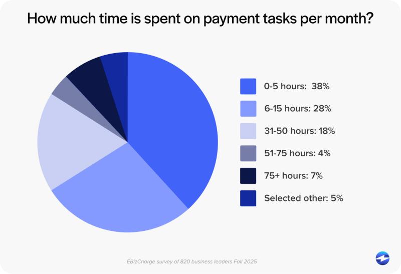 IRVINE, CA - December 2025 - A new study from EBizCharge reveals the extent to which businesses still rely on manual processes to manage invoicing, payment posting, reconciliation, and collections. According to the findings, 29% of companies spend 31 hours or more per month on payment-related tasks, with some teams reporting more than 75 hours.The survey collected responses from 820 business owners, CEOs, CFOs, controllers, and finance leaders across the United States and Canada. The study explored payment workflows, automation barriers, and the priorities leaders consider most important when evaluating new payment technologies.