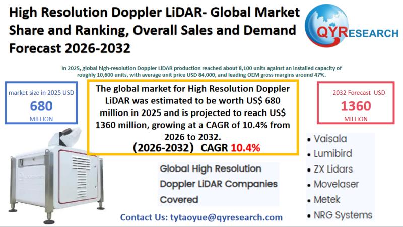 The global market for High Resolution Doppler LiDAR was estimated to be worth US$ 680 million in 2025 and is projected to reach US$ 1360 million, growing at a CAGR of 10.4% from 2026 to 2032.