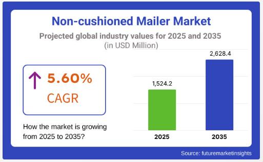 The global non-cushioned mailer market is on an accelerated growth path, propelled by surging e-commerce shipments and a heightened focus on eco-friendly packaging. According to recent research, the market is estimated at around USD 1,524.2 million in 2025 and is forecast to achieve roughly USD 2,628.4 million by 2035, registering a compound annual growth rate (CAGR) of about 5.6 % during the period 2025-2035.In this context, non-cushioned mailers-lightweight, efficient shipping envelopes that skip additional padding-are becoming the go-to in industries ranging from apparel and cosmetics to general merchandise. Simultaneously, regulatory pressures and consumer demand for sustainable packaging are accelerating uptake of recyclable and biodegradable formats, reshaping the industry's dynamics.