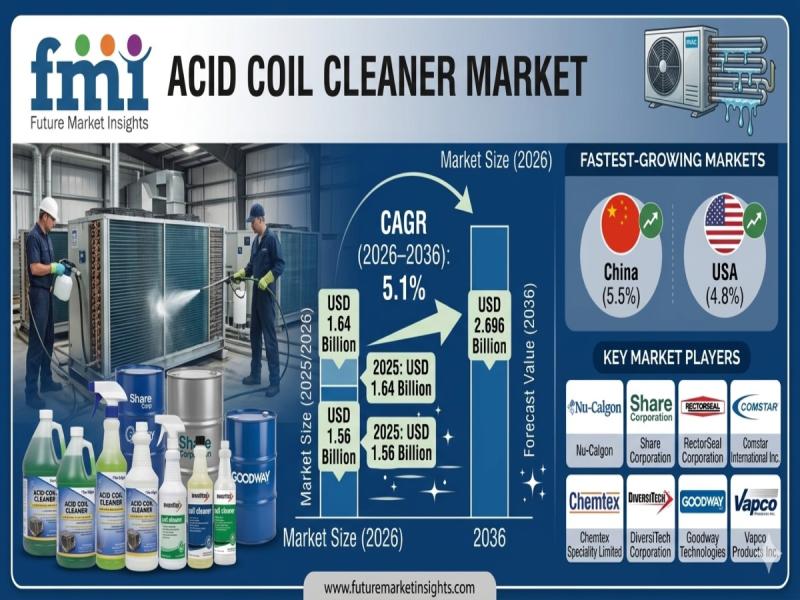The global acid coil cleaner market is entering a steady growth phase as industries prioritize HVAC system efficiency and preventive maintenance. According to the latest analysis, the market is valued at USD 1.640 billion in 2026 and is projected to reach USD 2.696 billion by 2036, expanding at a CAGR of 5.1%. The sector is expected to generate an incremental opportunity of USD 1.056 billion over the forecast period.