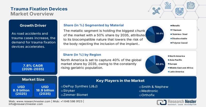 Market Outlook and Forecast The Trauma Fixation Devices Market is entering a dynamic phase of expansion, strengthened by rising procedural volumes, advancements in orthopedic technologies, and improved access to trauma care globally. In 2025, the market is valued at USD 8.9 billion, and based on current industry indicators and technology adoption patterns, it is expected to reach USD 18.9 billion by 2035, reflecting a CAGR of approximately 7.8% from 2026 to
