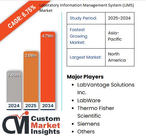According to Custom Market Insights (CMI), The Laboratory Information Management System Market was estimated at USD 2.45 Billion in 2024 and is expected to reach USD 2.61 Billion in 2025 and is expected to hit around USD 4.71 Billion by 2034, poised to grow at a compound annual growth rate (CAGR) of 6.75% from 2025 to 2034.