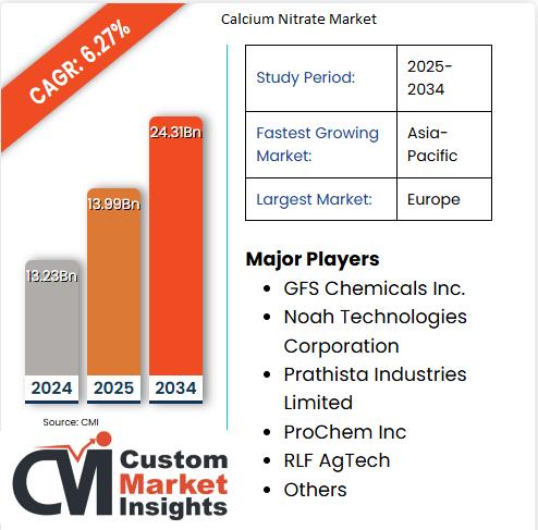 As per the current market research conducted by the CMI Team, the global Calcium Nitrate Market size is expected to record a CAGR of 6.27% from 2025 to 2034. In 2025, the market size is projected to reach a valuation of USD 13.99 Billion. By 2034, the valuation is anticipated to reach USD 24.31 Billion.