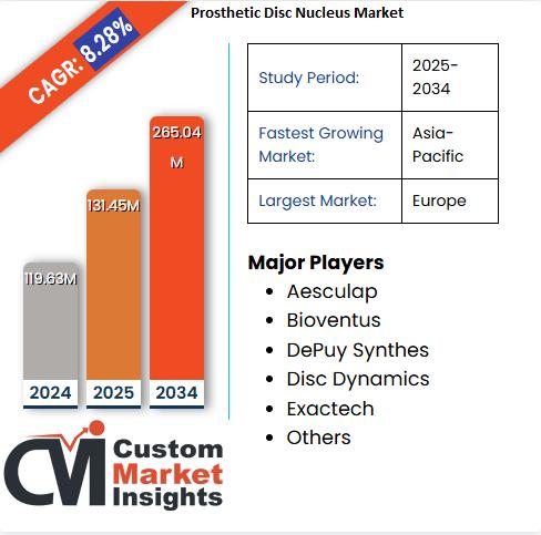 As per the Prosthetic Disc Nucleus Market size analysis conducted by the CMI Team, the global Prosthetic Disc Nucleus Market is expected to record a CAGR of 8.28% from 2025 to 2034. In 2025, the market size is projected to reach a valuation of USD 131.45 Million. By 2034, the valuation is anticipated to reach USD 265.04 Million.