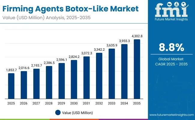 The global Firming Agents Botox-Like Market is witnessing rapid expansion, projected to grow from USD 1,853.7 million in 2025 to USD 4,302.8 million by 2035, reflecting an absolute growth of USD 2,449.1 million and a strong CAGR of 8.8%. Rising demand for clinically validated anti-aging ingredients and rapid advancements in peptide and encapsulation technologies are accelerating market penetration across premium skincare and professional aesthetics.
