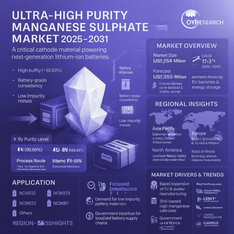 The global market for Ultra-High Purity Manganese Sulphate was estimated to be worth US$ 254 million in 2024 and is forecast to a readjusted size of US$ 955 million by 2031 with a CAGR of 17.3% during the forecast period 2025-2031.