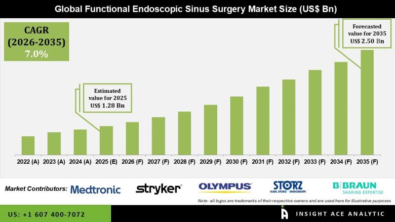 InsightAce Analytic Pvt. Ltd. announces the release of a market assessment report on the "Global Functional Endoscopic Sinus Surgery Market - (By Product (Endoscopes (Sinuscopes, Rhinoscopes), Surgical Instruments, Navigation Systems (Optical Navigation Systems, Electromagnetic Navigation Systems), By Procedure (Frontal Sinus Surgery, Ethmoid Sinus Surgery, Maxillary Sinus Surgery, Sphenoid Sinus Surgery, Others), By Indication (Chronic Sinusitis, Recurrent Sinusitis, Nasal Polyposis, Fungal Sinusitis, Others), By Patient Type (Adult Patients, Pediatric Patient), By…