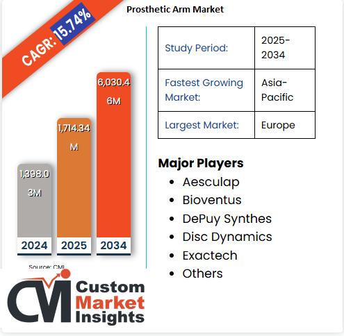 As per the Prosthetic Arm Market size analysis conducted by the CMI Team, the global Prosthetic Arm Market is expected to record a CAGR of 15.74% from 2025 to 2034. In 2025, the market size is projected to reach a valuation of USD 1,714.34 Million. By 2034, the valuation is anticipated to reach USD 6,030.46 Million.