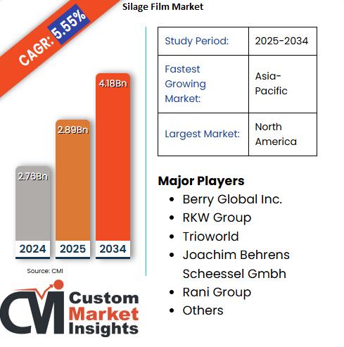 Global Silage Film Market size was valued at USD 2.89 Billion in 2025, and is projected to reach USD 4.18 Billion by 2034, growing at a CAGR of 5.55% over the forecast period 2025 - 2034.