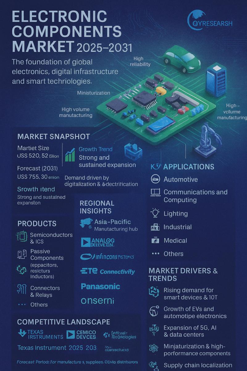 The global market for Electronic Components was estimated to be worth US$ 520.52 billion in 2024 and is forecast to a readjusted size of US$ 755.32 billion by 2031 with a CAGR of 5.5% during the forecast period 2025-2031.