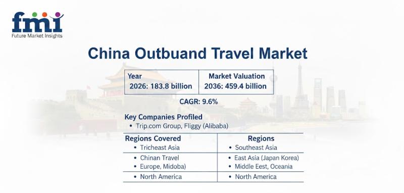 The China outbound travel market is projected to expand significantly over the next decade, increasing from USD 183.8 billion in 2026 to USD 459.4 billion by 2036, registering a CAGR of 9.6%. According to the latest analysis by Future Market Insights (FMI), growth is structurally driven by rising disposable income among China's middle class, expansion of visa-free travel agreements, and rapid AI integration into online travel booking ecosystems.