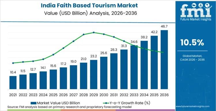 The India faith based tourism market is projected to expand significantly over the next decade, growing from USD 17.2 billion in 2026 to USD 46.8 billion by 2036, registering a CAGR of 10.5%, according to the latest analysis by Future Market Insights (FMI).