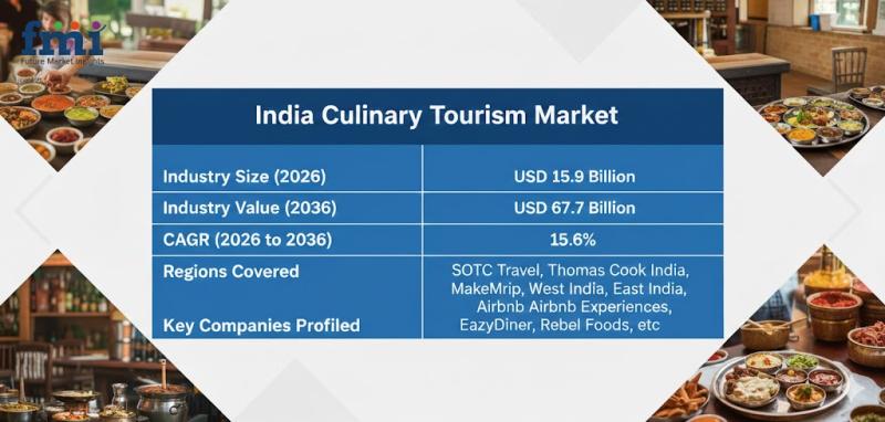 The India culinary tourism market is projected to expand robustly over the next decade, increasing from USD 15.9 billion in 2026 to USD 67.7 billion by 2036, registering a CAGR of 15.6%. According to the latest analysis by Future Market Insights (FMI), growth is structurally driven by government-led culinary identity programs, GI-tagged product promotion, and rising inbound and domestic food-centric travel demand.