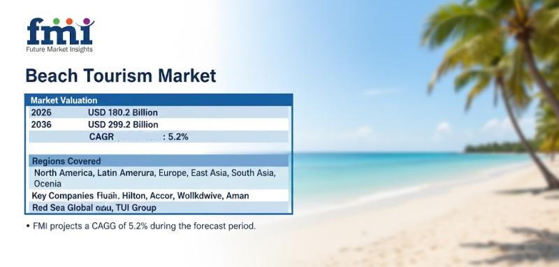 The global beach tourism market is projected to grow steadily over the next decade, expanding from USD 180.2 billion in 2026 to USD 299.2 billion by 2036, registering a CAGR of 5.2%, according to the latest analysis by Future Market Insights (FMI).