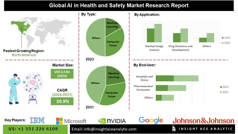 InsightAce Analytic Pvt. Ltd. announces the release of a market assessment report on the "Global AI in Health and Safety Market - (By Type (Machine Learning, Natural Language Processing (NLP), Computer Vision, Robotics, Expert Systems), By Application (Medical Image Analysis, Drug Discovery and Development, Virtual Nursing Assistants, Patient Data Management, Wearable Health Monitoring, Personalized Treatment Plans, Predictive Maintenance in Healthcare Facilities, Hospital Management and Operations Optimization), By End-User (Hospitals and…