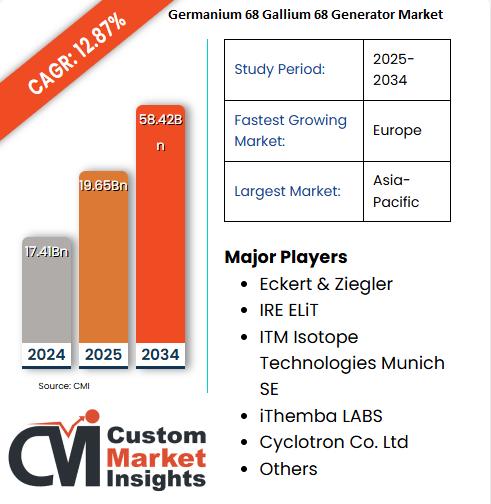 Global Germanium 68 Gallium 68 Generator Market size was valued at USD 19.65 Billion in 2025 and expected to reach USD 58.42 Billion by 2034, at CAGR of 12.87% during the forecast period 2025 - 2034.