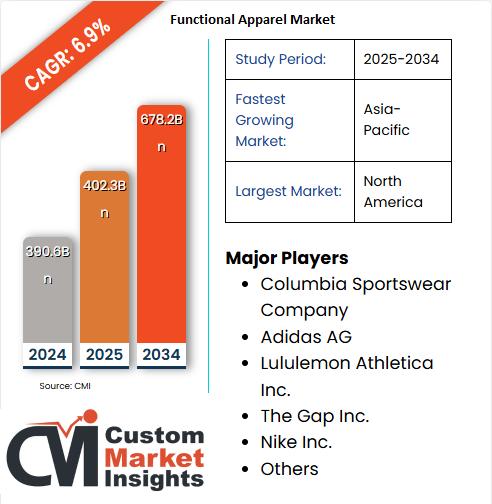 Global Functional Apparel Market size was valued at USD 402.3 Billion in 2025 and is projected to reach USD 678.2 Billion by 2034, growing at a CAGR of 6.9% over the forecast period 2025 - 2034.