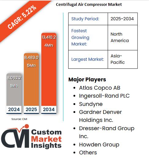 Global Centrifugal air compressor Market size was valued at USD 8,483.05 Million in 2025 and is expected to reach USD 13,410.24 Million by 2034, at a CAGR of 5.22% during the forecast period 2025 - 2034.