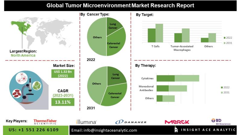 InsightAce Analytic Pvt. Ltd. announces the release of a market assessment report on the "Global Tumor Microenvironment Market - (By Cancer Type (Lung Cancer, Colorectal Cancer, Breast Cancer, Prostate Cancer, Bladder Cancer and Others (Melanoma, Kidney cancer, Ovarian cancer etc.)), By Target (T Cells, Tumor-Associated Macrophages, Myeloid-Derived Suppressor Cells, Cancer-Associated Fibroblasts, Regulatory T Cells and Others (Tumor-associated neutrophils, Dendritic cells etc.)), By Therapy (Monoclonal Antibodies, Cytokines, Cancer Vaccines, Oncolytic Viruses,…
